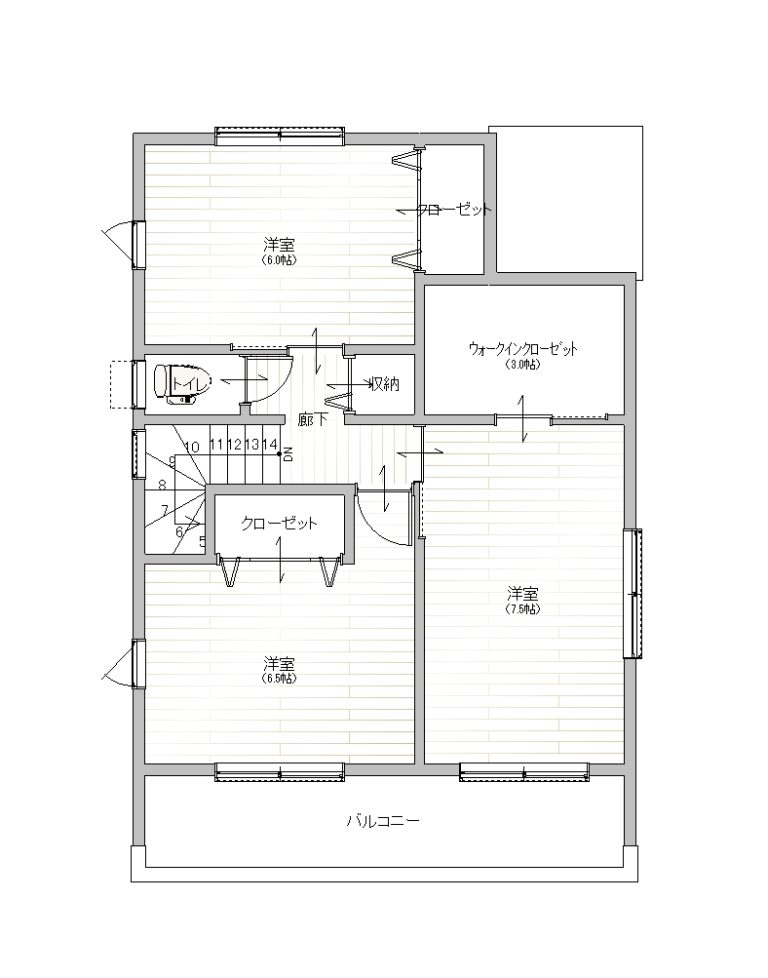 主寝室(7.5帖)は南向きの明るい空間で、3帖のウォークインクローゼット付き。